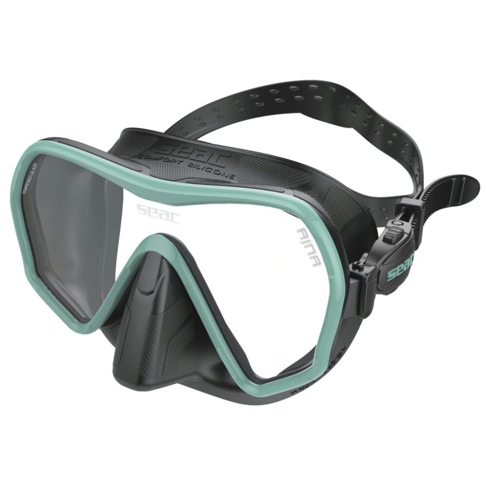 Seac Ajna is a single lens diving mask manufactured with frameless technology. This technology places the lens closer to the eyes, increasing the field of view.